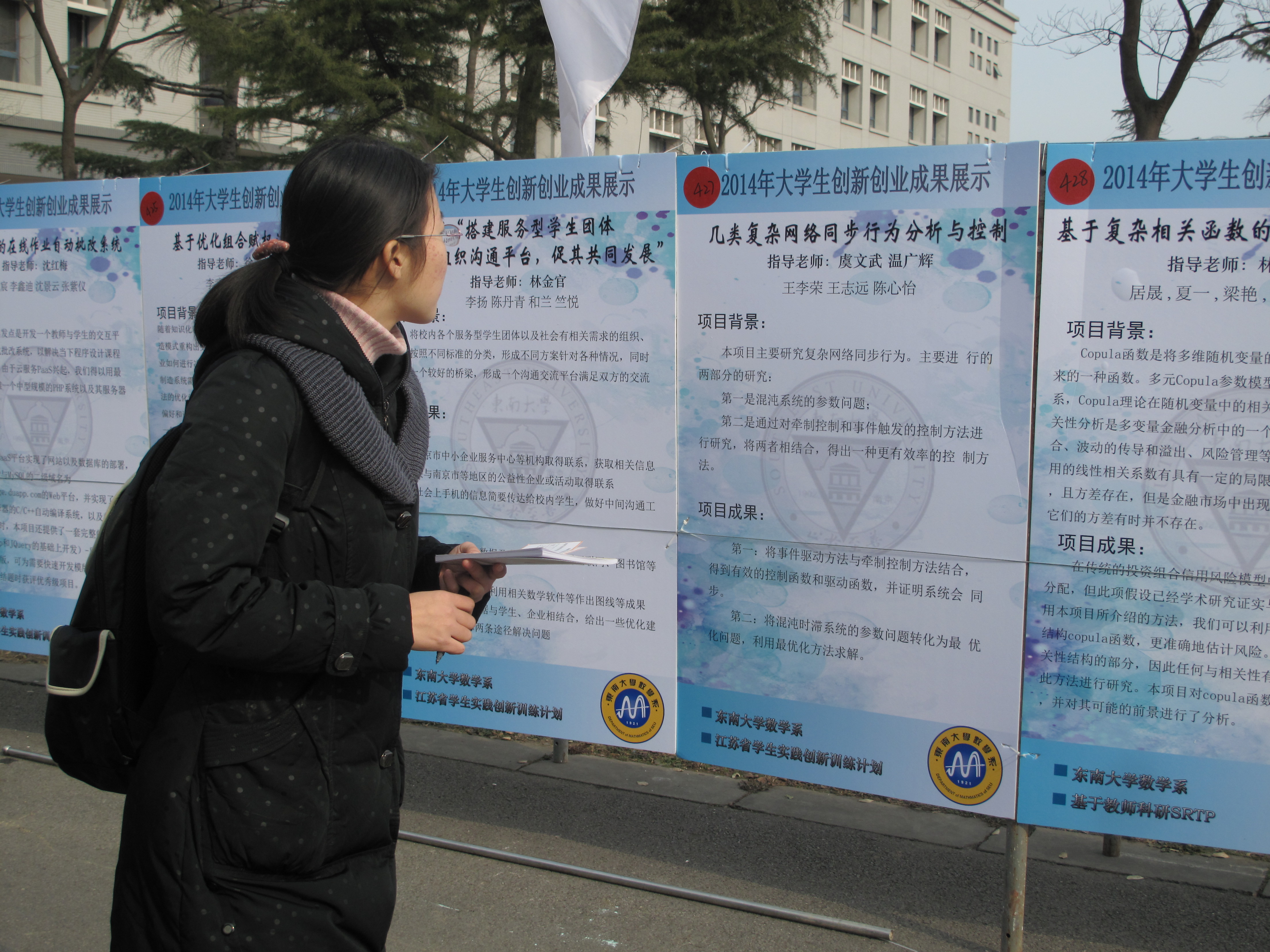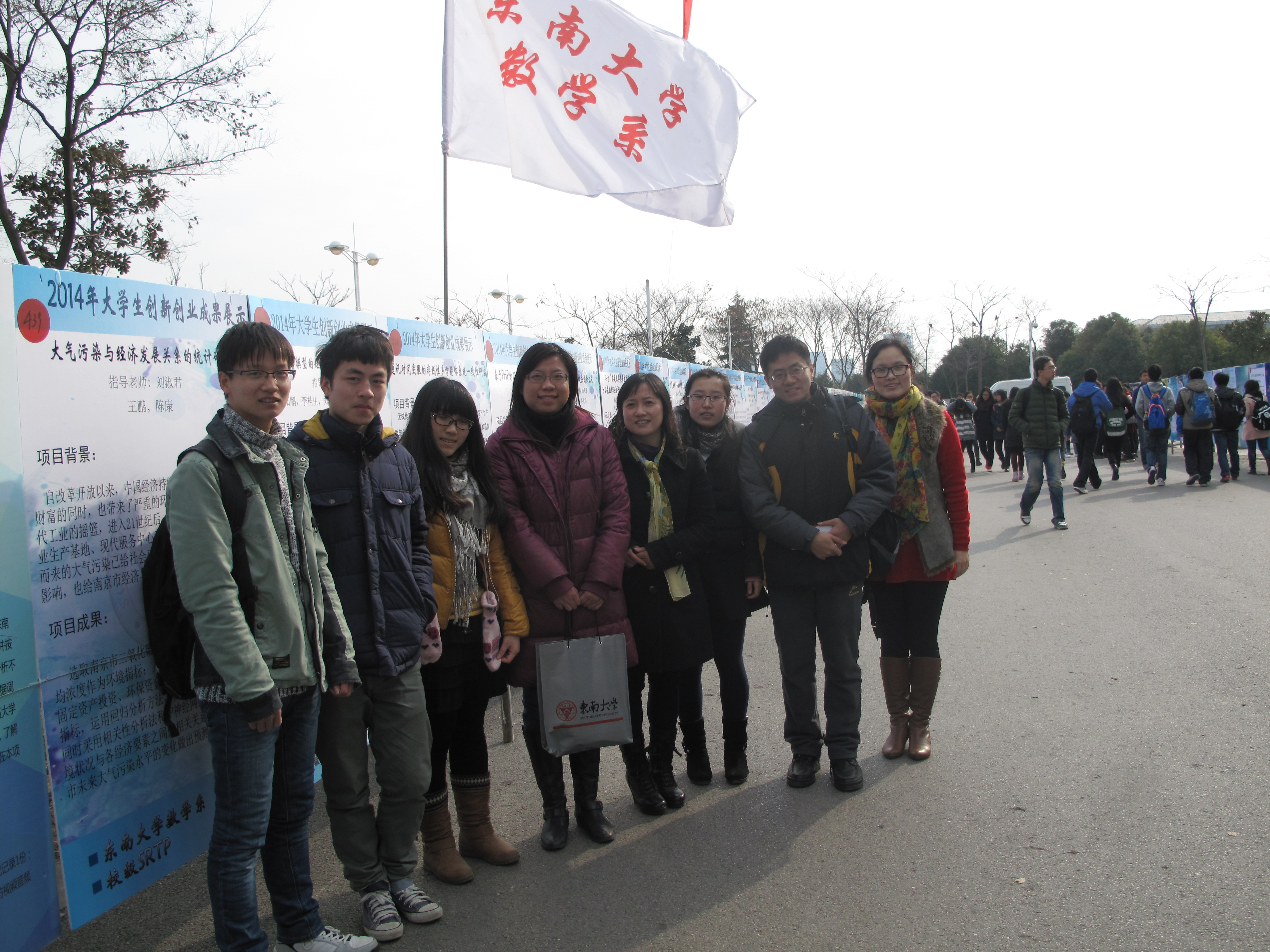 “第九届大学生创新创业成果展示会”在九龙湖校区如期举行。校党委副书记兼副校长刘波、副校长郑家茂、江苏省教育厅高教处副处长王兵,学校各有关部门负责同志、指导教师代表和学生代表等参加了展示会开幕式。开幕式由教务处处长雷威主持。 数学系系主任曹进德教授、党委副书记曹海燕老师、课外研学负责老师王小六老师和辅导员老师们参加了本次成果展。展示会上,数学系共展出成果展板18块,编号422-439,是近几年来展出数量最多的一年。这些展板按项目来源可以分为国创、省创、基于教师科研srtp以及校级优秀srtp。项目内容多样,有理论研究,例如陶为润小组的“偏微分方程的定性研究”;有具体应用,例如王鹏小组的“大气污染与经济发展关系的统计研究”;此外还有理论与应用,例如闫建璐小组的“二元极值模型的态密度估计及其应用”等。 展示会上,我系同学纷纷来到展示会现场驻足观看,我系自己的展板和来自全校各个院系的形式多样的成果展板或实物。展示会仪式结束后,我系党委副书记曹海燕、王小六老师、黄性芳老师、袁煜昶老师等与同学们合影留念。 据悉,本届展示会共展示作品及项目成果478件,其中实物105件,主要包括2014年已经结题验收的国家级、省级大学生创新训练计划项目,2013年和2014年基于教师科研的SRTP项目、校级SRTP项目,以及在各级各类学科竞赛中取得优秀成绩的作品等。另外,此次展示会还邀请了上海交通大学、同济大学、浙江大学、南京大学、南京航空航天大学、南京邮电大学等高校的13件优秀作品参展。展会期间,同学们现场投票评选出了“我最喜爱的20件作品”,并由专家评选出了优秀作品。 这次展示会共持续三天,既是对参展项目同学创新精神与实践能力的肯定和表扬,也是对广大学子的鞭策与激励,更将广泛、深入地推动我校本科生开展科技创新活动,希望通过展示会,点燃同学们的创新激情,激励更多的同学走上创新创业之路,成为国家社会经济发展所需要的卓越人才。 |