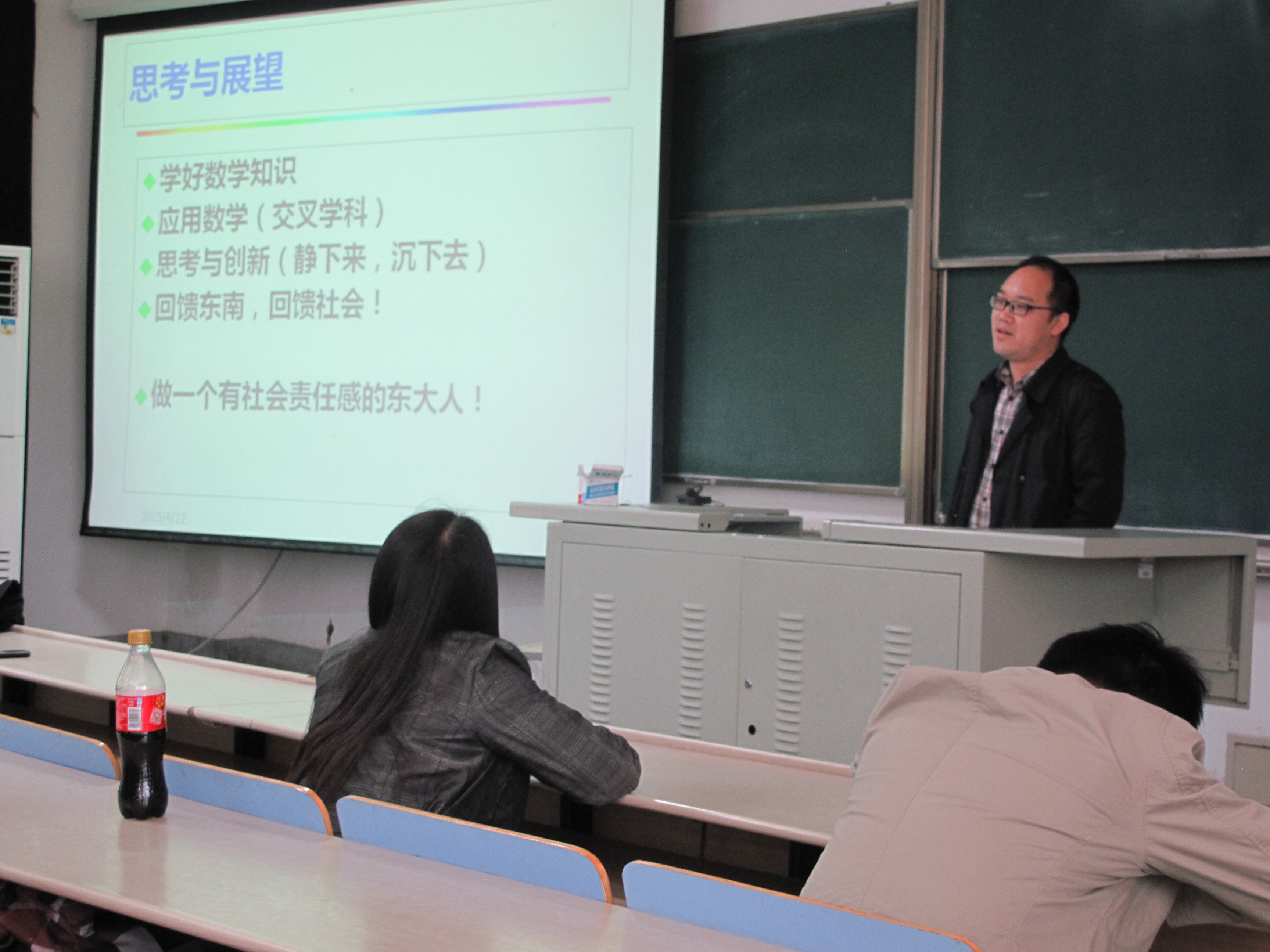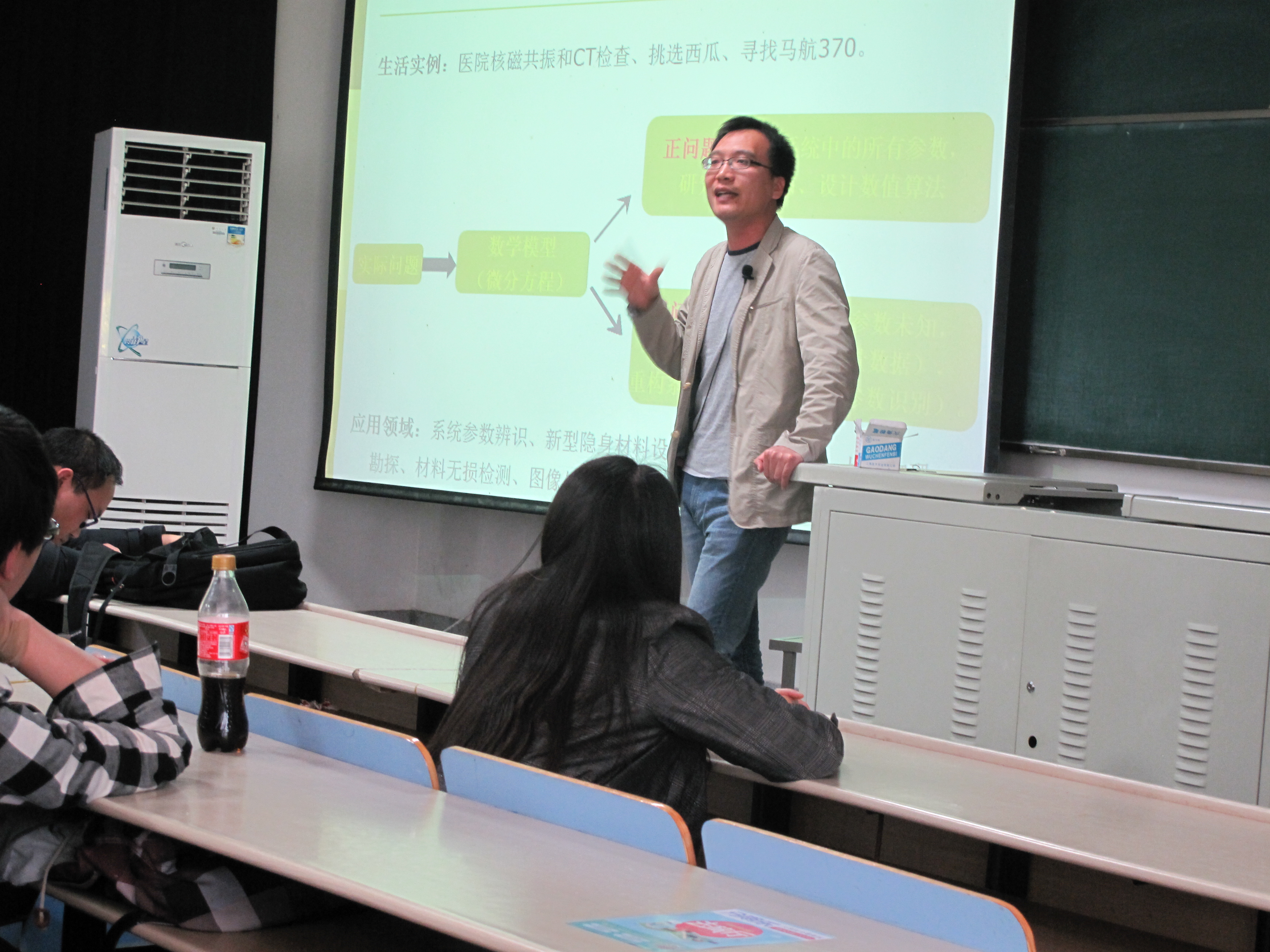 2015年4月22日下午,“数学系成长高端论坛”之学科团队前沿展示会在教8―102成功举办。 成长高端论坛由数学系团委主办,是数学系科技节期间一项大型的学术交流和经验传承活动,每届成长高端论坛都会邀请到学术大家,杰出校友,优秀学长与在校学生进行交流,在数学系乃至全校引起良好的反响,自2009年至今已成功举办至第七年。 本次展示会由数学系科技协会副主席陈璇同学主持,主要面向本科大二、大三的学生,邀请了数学系党委副书记曹海燕老师,系副主任虞文武教授,李玉祥教授,梁金玲教授,张小向副教授,曹婉容副教授,王海兵副教授和黄性芳老师等,就数学系现有的各个学科团队情况与同学们展开了很好的展示交流与分享。 展示会上,虞文武教授首先分享了复杂系统与复杂网络团队的研究现状与方向,其后梁金玲教授讲述了她所带领的团队所研究的无线传感网络结构相关知识,李玉祥教授和曹婉容副教授分别简要地介绍了偏微分方程和微分方程数值解的发展前景,张小向副教授分享了代数的前沿方向,王海兵副教授分享了介质成像和大规模科学计算领域的相关知识,黄性芳老师则主要介绍了她所在的统计专业团队的研究方向和课题。 在老师们热情洋溢的介绍后,老师们悉心解答同学们许多好奇的疑问,虞文武教授和梁金玲教授还就到底是国内读研还是国外读研更有优势等问题给出了相关的解释和指导。最后,曹海燕副书记对本次展示会做出总结,建议同学们能够在这些饱满的信息量中提取出自己所需要的信息,并针对同学们的选择和发展提出了自己的想法和建议。 本次数学系学科团队前沿展示会在同学们热烈的掌声中圆满地落下帷幕,不仅增强了数学系师生之间的交流,为同学们提供了关于数学的诸多团队研究方向的大量信息,更是一如既往地在打造前瞻性、导向性、学术性与普及性的公益性高层次平台,吸引了越来越多的学生目光,正成为学生成长的一片沃土。同学们感悟数学真谛,了解数学人在社会中发挥的作用,选择适合自己的专业道路,为今后的工作和学习树立了更强的信心! |