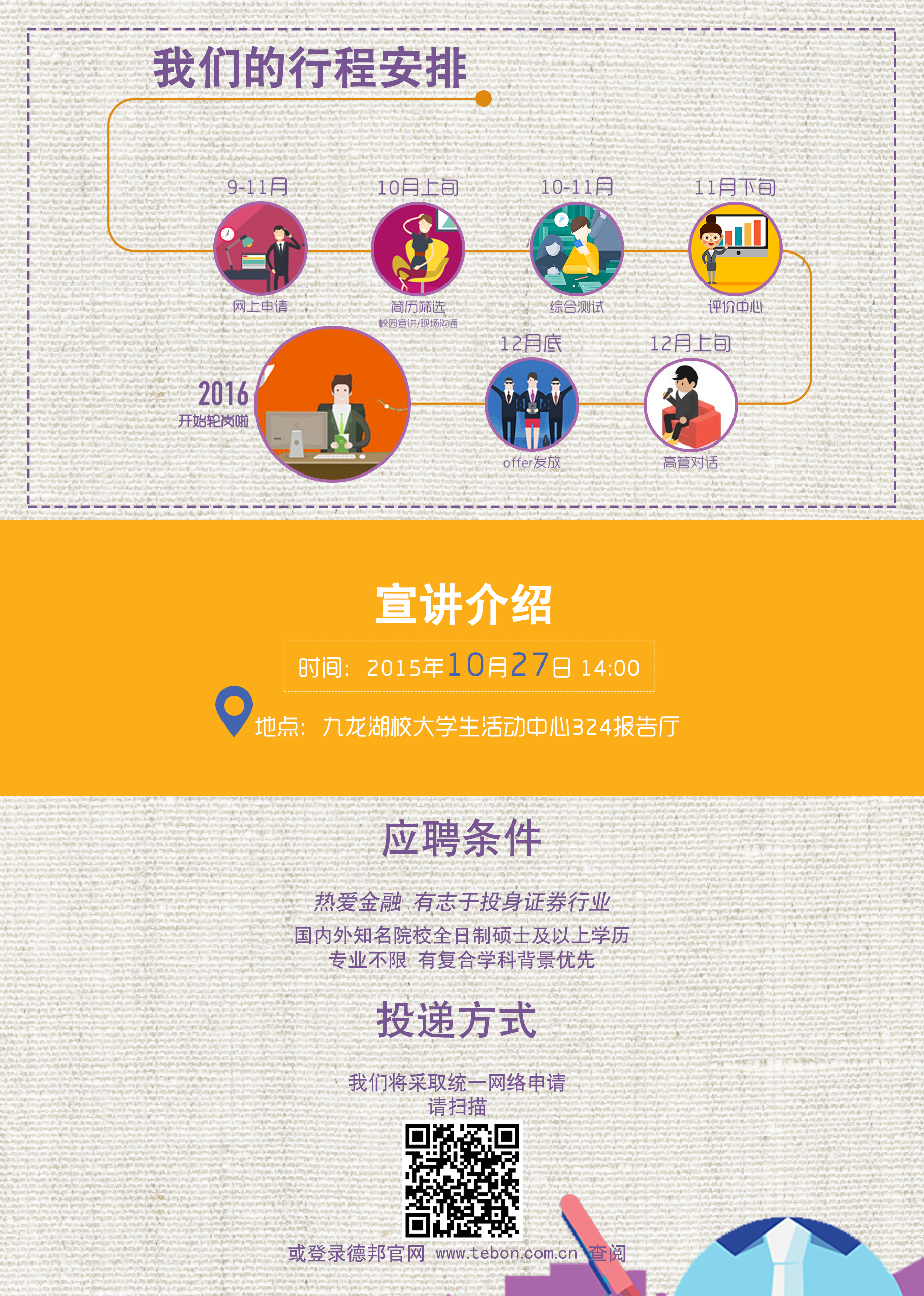 | 一、德邦证券股份有限公司 德邦证券股份有限公司是经中国证券监督管理委员会批准设立的全国性综合类证券公司。旗下拥有中州期货有限公司、德邦基金管理有限公司、德邦星睿投资管理有限公司、德邦星盛资本管理有限公司。 本次校园招聘预计招收100名管理培训生。详情见附件。 宣讲会时间:2015年10月27日14:00 地点:九龙湖校区大学生活动中心324报告厅 二、睿辰欣创(南京模拟技术研究所软件中心) 主要招聘软件和硬件工程师等职位。详情见附件。 宣讲会时间:10月29日14:00 地点:南京航天航空大学(将军路校区)东区D1102教室 |
