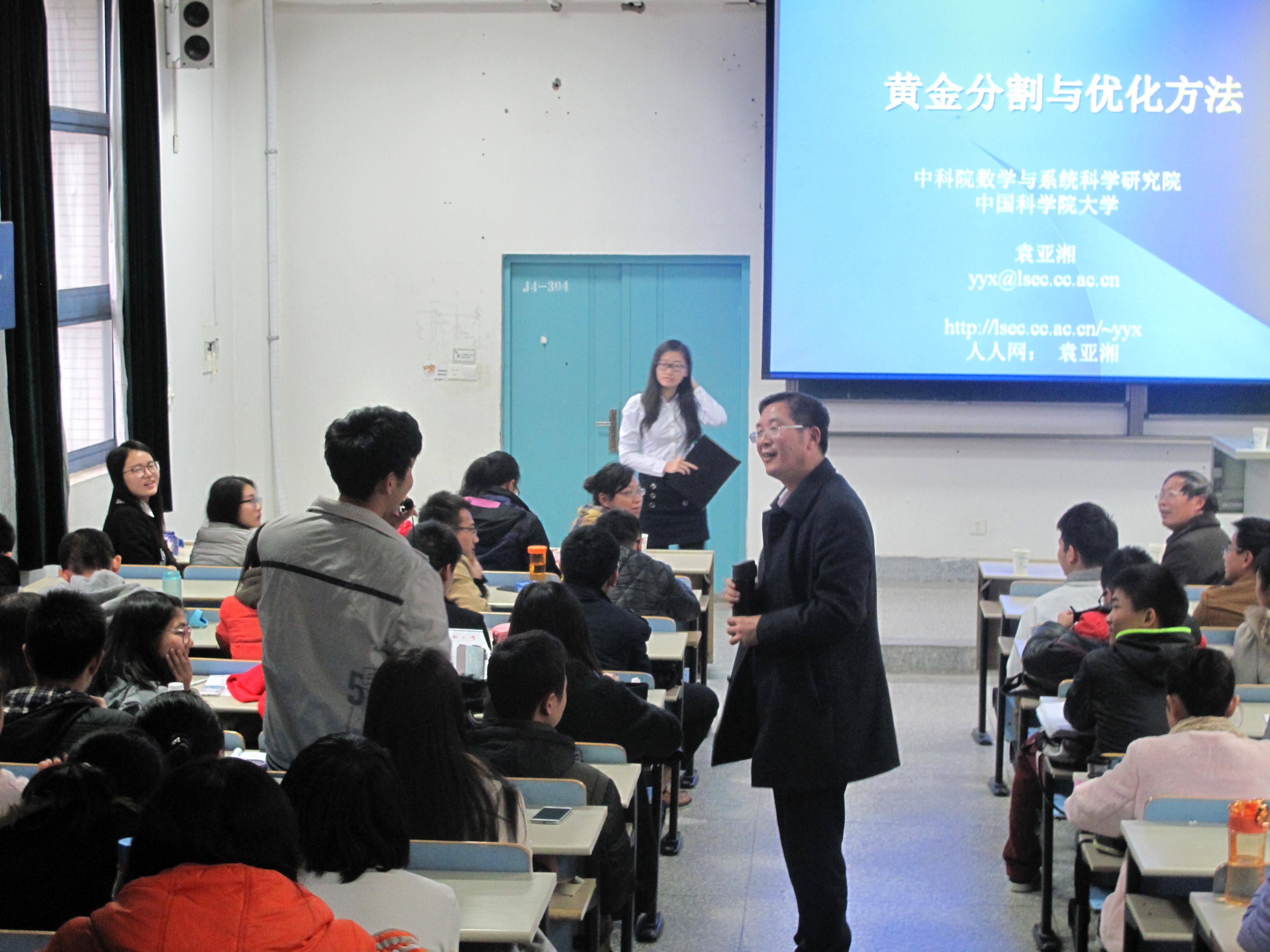 11月28日下午15:30,数学系科协邀请到了运筹学专家,来自中科院的袁亚湘院士,于教四-304进行了题为“黄金分割与优化方法”的课外研学讲座,并取得了圆满成功。出席本次讲座的领导嘉宾有数学系主任曹进德教授,数学系党委副书记曹海燕老师,以及数学系的刘继军教授,孙志忠教授,林文松教授和吴建专老师,关秀翠老师,聂小兵老师和贺丹老师等,还有来自全校各个院系近250名同学慕名而来,感受袁亚湘院士带来的高起点,低落点,学术氛围浓厚而又不失趣味性的讲座。 来自数学系科协的主持人矫文薇同学对袁亚湘院士进行简单的介绍后,袁亚湘院士就开始了他的演说。袁院士的讲座内容主要分为三部分:黄金分割,线性规划和优化问题。在每一部分中,他都采取以简单有趣的例子开头,以复杂高深的理论结尾的模式。演讲层层深入,引人入胜。 在黄金分割部分,他先从五角星入手,逐渐过渡到了欧几里得对黄金分割的首次提出,接着便是达芬奇、开普勒、欧姆等人对黄金分割比例计算的不断探索。此部分重点介绍了华罗庚根据黄金分割而提出的“优选学”及其广泛应用。 随后,袁院士通过一个选取最优点的例子,兔子繁殖问题,田忌赛马问题,欧拉七桥,邮递员问题,最短路线问题等一系列妙趣横生却又耳熟能详的例子引出了线性规划的概念。接着便转入对线性规划问题的讲解,重点介绍了线性规划的内点法。 最后一部分,袁院士给出了优化问题的定义,即“任何存在/需要决策的问题都是优化问题”。优化问题涉及领域广泛,很多问题的解决都要转化为一个优化问题来解决。接下来是优化问题的实例,简单到电影评价,电影打分,复杂到图像存储,压缩感知,袁院士妙语连珠,同学们全神贯注。 袁院士演讲结束后,进行了与同学的互动环节。同学们都积极发言提问,不放过与院士面对面对话的机会。对于同学们提上来的问题,袁院士都耐心认真的进行了解答。 这次讲座,袁院士为我们娓娓道来“黄金分割与优化问题”的前世今生,引经据典,风趣幽默又不失严谨,生动精彩更直击要点,整场讲座下来,令同学们对黄金分割与优化问题有了更清晰的了解,更深刻的体悟。希望同学们可以从袁亚湘院士的讲座中得到更多的收获,时刻激励自己继续努力,不断进步,超越自我! 袁亚湘, 1981年毕业于湘潭大学,1986年获英国剑桥大学博士学位。中国科学院数学与系统科学研究院研究员。全国政协委员,中国科协委员。中国数学会理事长,中国运筹学会名誉理事长。曾任中国科学院数学与系统科学研究院副院长、计算数学与科学工程计算研究所所长、“科学与工程计算”国家重点实验室主任。 主要从事计算数学、应用数学、运筹学等方面的研究工作。在最优化计算方法的构造、理论分析以及应用等方面取得了系统的重要研究成果。特别是在信赖域法、拟牛顿法、非线性共轭梯度法等方向上做出了突出的贡献。1996年获中国青年科学家奖,1998年获中国十大杰出青年称号,2006年获国家自然科学二等奖,2011年获中国数学会陈省身奖,同年当选中国科学院院士以及当选美国工业与应用数学学会会士,2012年当选美国数学会首届会士。2014年当选巴西科学院通讯院士,获得发展中国家科学院(原第三世界科学院)数学奖。 |