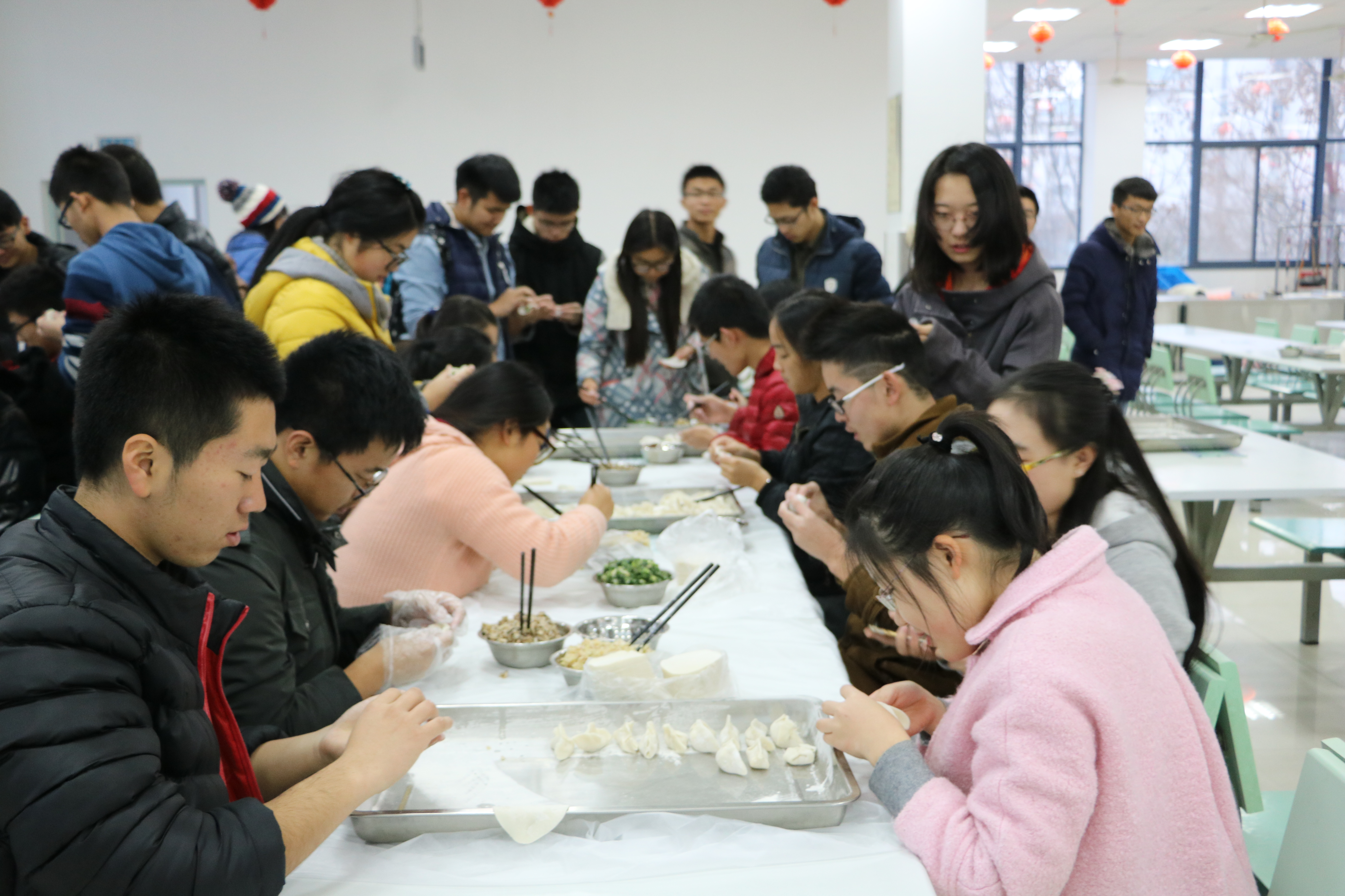 下午4时,由数学系领导、老师及本科生、研究生所有班级同学一起参加的“团圆饺子宴”在梅园食堂二楼热闹开幕。数学系近300位师生齐聚一堂,一起围桌而坐,吴书记宣布饺子宴开始后,大家分工明确,一切进行得秩序井然。看到饺子馅和饺子皮纷纷端上桌时,师生们都摩拳擦掌、跃跃欲试,准备大显身手。同学们包的饺子各式各样,形态各异,有花边形的,有馄钝样的,有包子款的,甚至还有创意地组合套餐形的,包饺子现场成了创意大赛,热闹非凡。在吴书记和曹主任的鉴赏中,我们还评选出了7个“7系最美饺子”。包好后的饺子都被送到后厨,待食堂师傅推着热气腾腾的饺子车过来时,学生们都迫不及待地一拥而上,尽情地享受着,师生们一起边吃边聊,其乐融融,到处洋溢着温暖和谐的气氛。