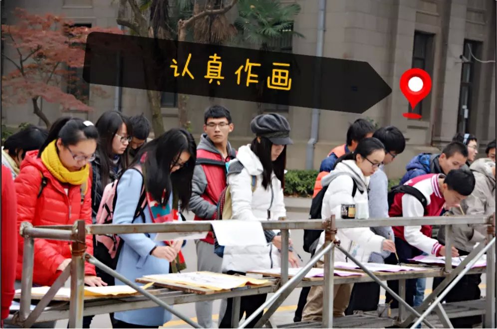 在微风的吹拂下,我们的绘画队伍成为四牌楼主干道上的一道亮丽的风景线。特别是一位同学的画作,吸引了众人的眼球,让人有身临“画中有诗,诗中有画”意境的感觉。我们的现场十分热闹,吸引了路过的对水墨画有兴趣的老人,他们驻足观看,拍手叫好,更有小朋友一起作画。同学们纷纷拿出手机或相机拍照。应班长和团支书的号召,我支部同学分成了三排,合影留念。我们双手摆出“7”字样,喊出“七系最棒”的口号。笑容在此定格,感情却在升温。