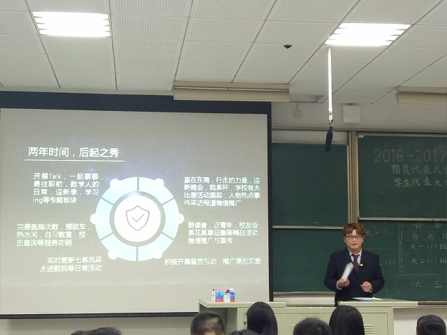 本次会议分为三部分:首先由伊莉论坛 学生会主席和学生团委副书记进行工作汇报,随后将由各学生组织负责人分别宣读学生会修改章程、新媒体章程、科协章程,会议的最后将进行新一届学生团委副书记、学生会主席团的选举。