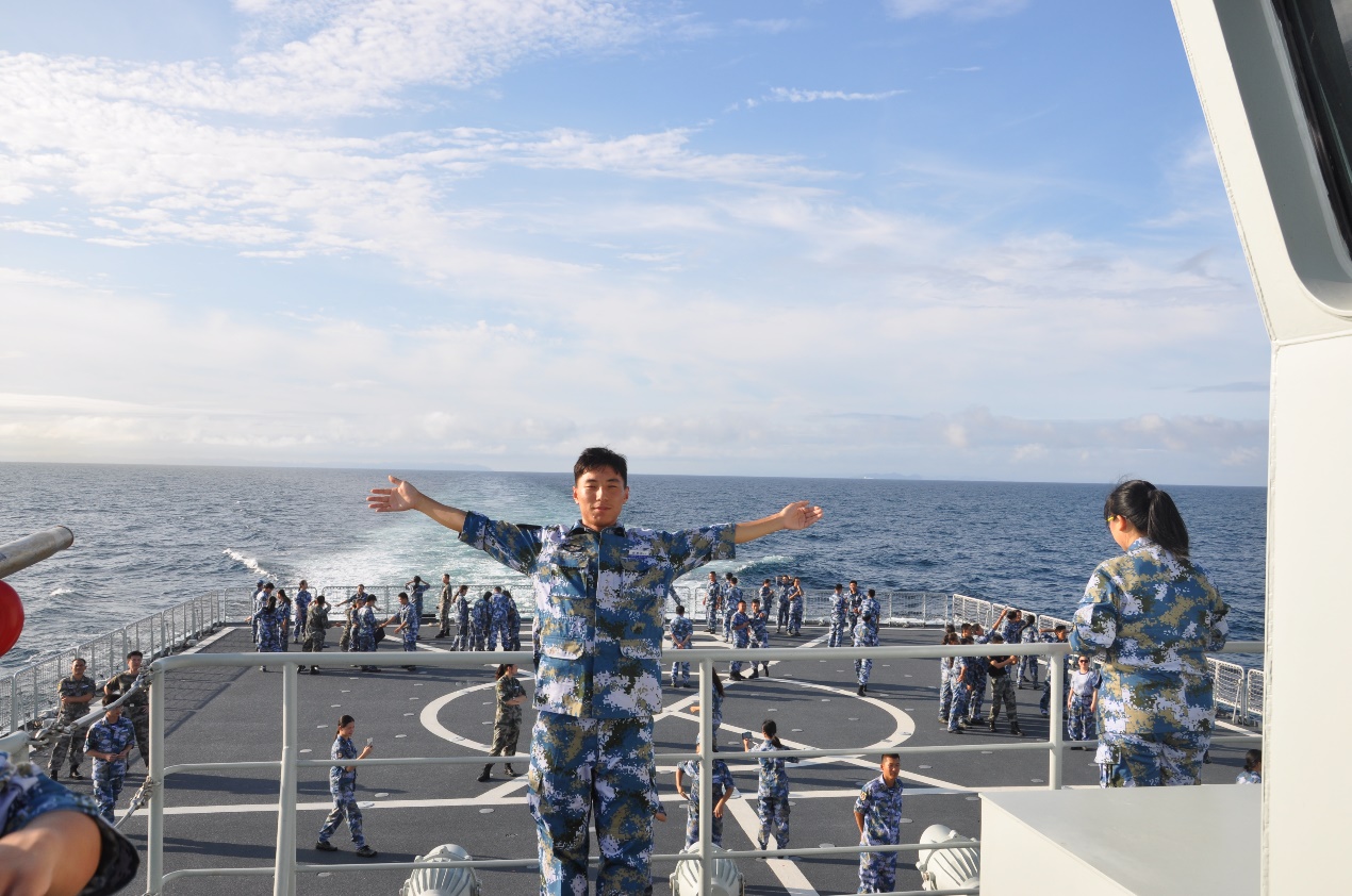 当问及他参营感受时,孙师伟说:“这次训练营活动有很多让我感动和难忘的瞬间。在八一建军节在甲板举行隆重升旗仪式的时候,那一刻,对祖国和解放军的热爱油然而生,那是来自内心深处的震撼和感动。今年正值人民解放军建军90周年,我用参加全国学生军事训练营这种方式,感受了军人的训练与生活。我深深地感觉到国家在发展壮大,我为祖国现在的繁荣富强而感到自豪。”
