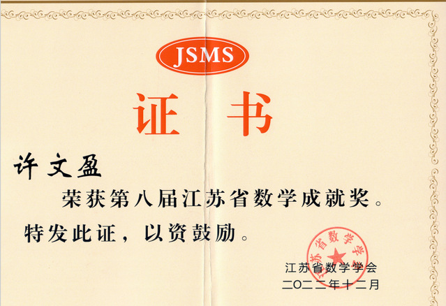 2022年12月17日-18日江苏省数学学会在扬州大学举办了2022年江苏省数学论坛会议,伊莉论坛 许文盈副研究员荣获第八届江苏省数学成就奖。