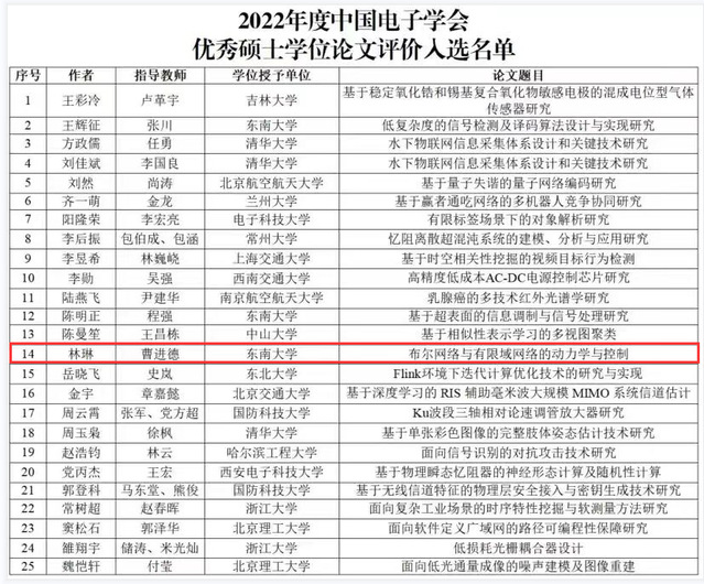 伊莉论坛 2021届硕士毕业生林琳的学位论文《布尔网络与有限域网络的动力学与控制》(导师:曹进德)入选2022年度中国电子学会优秀硕士学位论文。