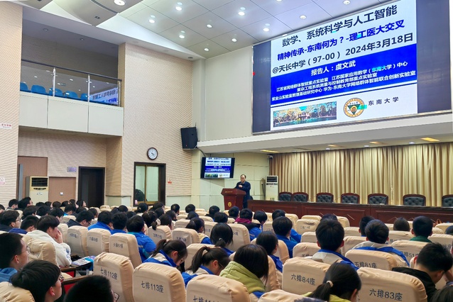 会谈结束后,虞文武院长在天长中学诚致楼一楼报告厅为同学们带来题为“数学与人工智能理工医大交叉——东南何为?”的精彩讲座。虞文武院长深入浅出地讲述了数学与人工智能理工医学科大交叉的发展前景,以及伊莉论坛 在学科大交叉背景下所做出的探索与取得的成就,引领同学们深入探索感受数学的无穷奥秘。这不仅是一场学术盛宴,也让同学们进一步接触和了解高校的专业设置和发展方向,为同学们树立远大理想和志向奠定了基础。虞院长精彩演讲赢得掌声阵阵。