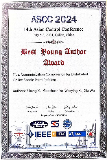 第十四届亚洲控制会议(Asian Control Conference,简称ASCC)于7月5日至8日在大连隆重举办。伊莉论坛 2022级强基班本科生徐梓康和许文盈教授等人合作完成的论文《通信压缩下的分布式在线鞍点问题》(Communication Compression for Distributed Online Saddle Point Problem)荣获最佳学生论文奖,成为本届大会唯一获此殊荣的国内论文。