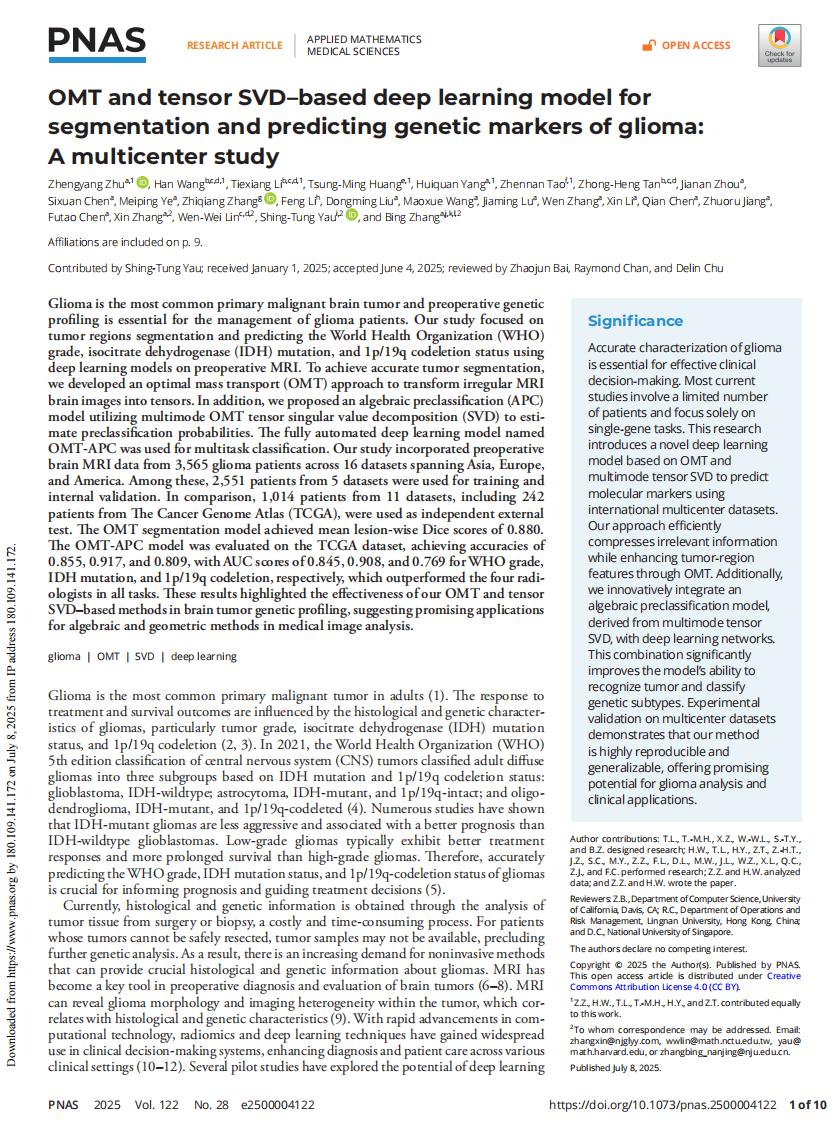 2025年7月9日,伊莉论坛 、丘成桐中心李铁香教授与合作者在国际顶级学术期刊《美国国家科学院院刊》(Proceedings of the National Academy of Sciences of the United States of America,PNAS)上发表题为《用于神经胶质瘤分割和遗传标记预测的基于最优传输和张量奇异值分解的深度学习模型:一项多中心数据研究》(OMT and tensor SVD based deep learning model for segmentation and predicting genetic markers of glioma: a multicenter study)的学术论文。《美国国家科学院院刊》是国际顶尖综合性期刊,与Nature、Science、Cell并称全球四大综合科学期刊,近五年影响因子为10.6,位列中科院SCI一区12,学科涵盖生物、物理、化学、数学及社会科学,多学科大类排名前5%,对原创性要求极高。