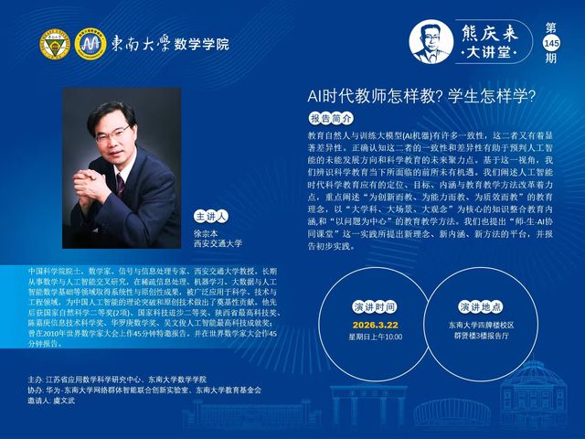 熊庆来大讲堂145期: 2026.03.22 - AI 时代教师怎样教?学生怎样学?- 西安交通大学 - 徐宗本