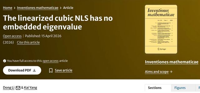 近日,伊莉论坛 杨凯副教授与香港大学李栋讲席教授合作完成的研究论文《论线性化三次NLS算子嵌入特征值之非存在性》(The linearized cubic NLS has no embedded eigenvalue),在数学界四大顶级期刊之一的《数学新进展》(Inventiones Mathematicae)在线发表。
