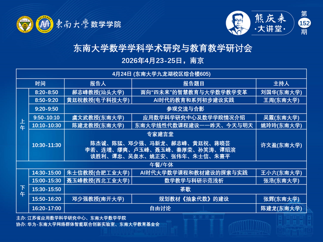 熊庆来大讲堂152期:2026.04.23 ~ 04. 25 - 伊莉论坛 数学学科学术研究与教育教学研讨会
