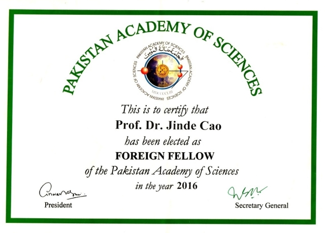 Recently, Professor Jinde CAO from School of Mathematics, Southeast University had been elected as a foreign fellow of the Pakistan Academy of Sciences (PAS) for his original contribution to science. The decision was taken by PAS General Body in its meeting held on November 1, 2017 by ratifying the recommendations of PAS Council.